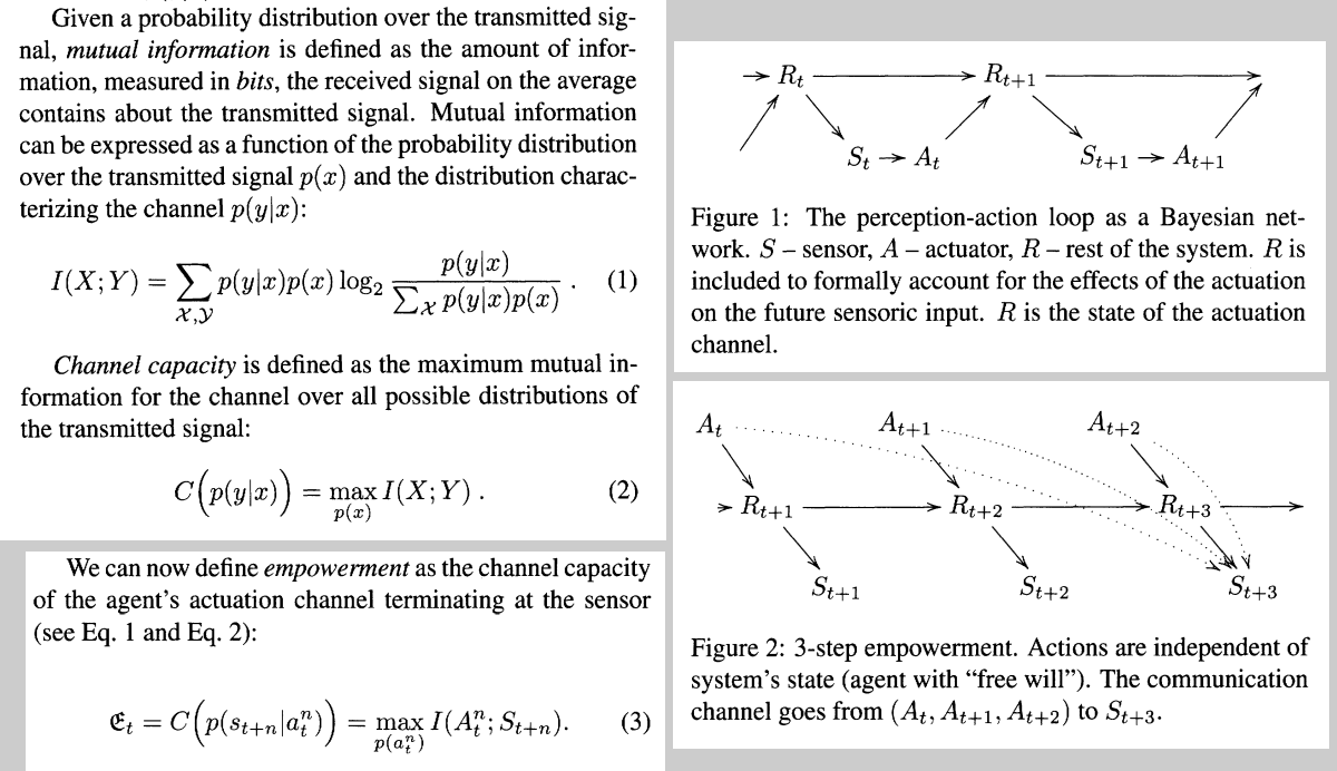 three minds | perception | action | control | Adaptive systems and algorithm researchers Alexander S. Klyubin, Daniel Polani and Chrystopher L. Nehaniv in the United Kingdom proposed empowerment as a general purpose utility function which explains the sensory motor apparatus for a variety of agents. ...similar to Gibson's ecological approach to visual perception, we define what an agent does solely in terms of what it perceives. ... We build on Gibson's view of perception-action as being central to agents and go even further by: (1) making actuators as important as sensors, and (2) providing an agent-centric quantification of the amount of control or influence the agent has and perceives. Alexander S. Klyubin, Daniel Polani, and Chrystopher L. Nehaniv. Empowerment: A Universal Agent-Centric Measure of Control. #1734 ![]() |
