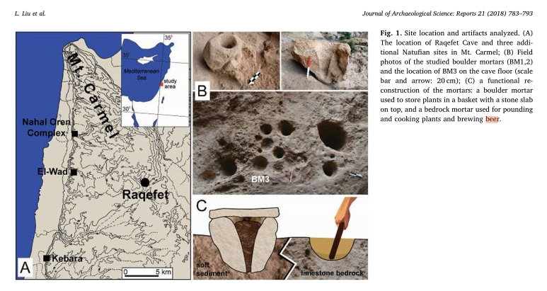three minds | drinking | brewing | experimenting | Archeologists Jiajing Wang and György Lengyel reported on the ritual use of alcoholic beverages by the pre-agricultural Natufians at the Raqefet Cave in Israel. The Natufians at Raqefet Cave collected locally available plants, stored malted seeds, and made beer as a part of their mortuary rituals to venerate the dead and/or to enhance group cohesion among the living ... They used stone mortars as brewing facilities, involving three basic stages: malting, mashing, and fermenting. The deep boulder mortars (BM1 and BM2) were used at least in part as storage containers for keeping cereals and USOs, including malted wheat/barley; the bedrock mortar (BM3) was used for pounding, cooking, and brewing beer (Fig. 1C). The Raqefet Cave mortars reveal the earliest evidence for making basketry with bast fibers, including flax, as malting equipment. Using boulder mortars for food storage was a significant innovation, which may have facilitated the shift towards a sedentary life style ... The time and effort invested in the manufacture of deep stone mortars in mortuary contexts and in acquisition of knowledge apparently required for beer brewing indicate an important ritual function played by alcoholic beverages in the Natufian culture. The Raqefet Cave beer was likely very low in alcoholic content, but it accounts for the earliest known experiment in making fermented beverages in the world. Jiajing Wang, György Lengyel. Fermented beverage and food storage in 13,000 y-old stone mortars at Raqefet Cave, Israel: Investigating Natufian ritual feasting. #1748 ![]() |