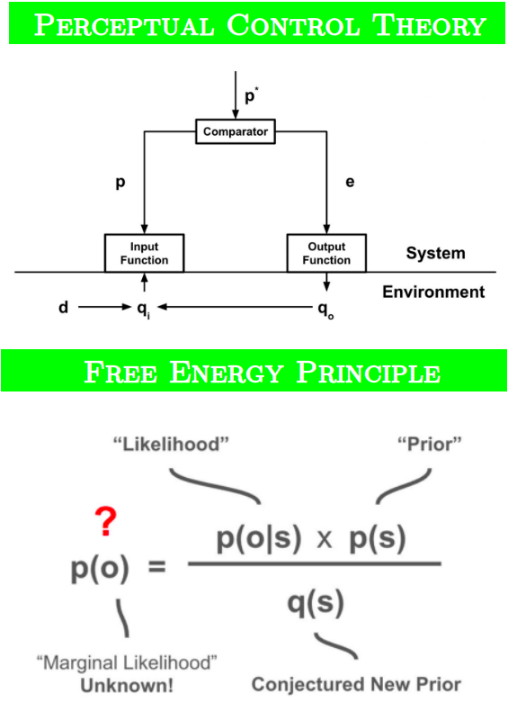 three minds | external negative feedback | internal generative model | Theoretical and computational neuroscientists Ty Roachford, Warren Mansell and Rodrigo Pena compared Perceptual Control Theory and the Free Energy Principle. They concluded that the two frameworks are complementary. PCT achieves a mechanistic definition of behavior by focusing on a ubiquitous physical feature that living and some non-living things must have—namely, control through mechanistic negative feedback. This is in contrast to the FEP, which achieves a statistical definition of behavior by ubiquitously interpreting all things as minimizing free energy over a generative model. Whilst PCT redefines behavior as the control of perception, FEP redefines behavior as the reduction in uncertainty about states expected to bring about preferred perceptions. To put it even more simply, PCT regards control as fundamental and as a precondition for probability estimation, whereas FEP regards information as fundamental and as a precondition for control. At their core, PCT systems have no internal model to maintain and update, and require no information for probability theory to utilize, whereas an internal world model updated by reducing uncertainty through new information is fundamental to FEP. Ty Roachford, Warren Mansell, Rodrigo Pena. PCT vs. FEP: A Comparison Between Reorganization Theory and Bayesian Inference. Ty Roachford: "PCT vs. FEP: A Comparison" #1744 ![]() |