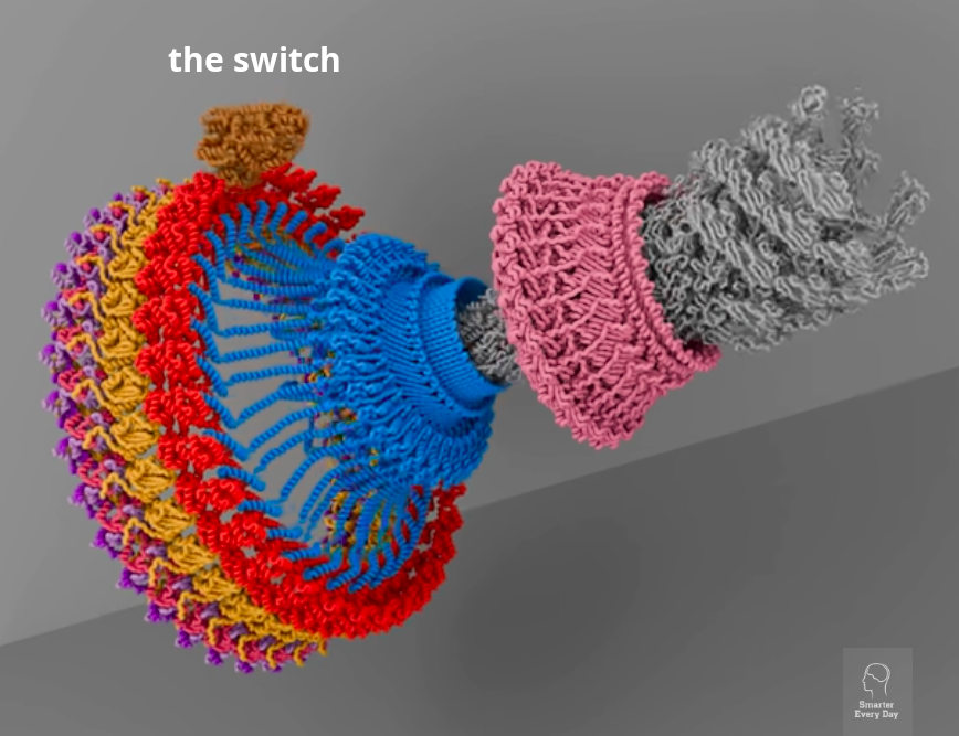 three minds | straight | random | switch | Bacteria flagellar motors rotate clockwise (untangling the flagella and making the bacteria tumble randomly) or counterclockwise (wrapping the flagella into a whip and making the bacteria swim straight). An excitatory regulator CheY, when phosphorylated by enzyme CheA kinase, triggers the switch from swimming to tumbling. The motor is thought to have evolved from ATP synthase employed as a primitive secretion system. Smarter Every Day. Nature's Incredible Rotating Motor (It’s Electric!) Prashant K. Singh, Pankaj Sharma, Oshri Afanzar, Margo H. Goldfarb, Elena Maklashina, Michael Eisenbach, Gary Cecchini, T. M. Iverson. CryoEM structures reveal how the bacterial flagellum rotates and switches direction. Renyi Liu, Howard Ochman. Stepwise formation of the bacterial flagellar system. #1755 ![]() |